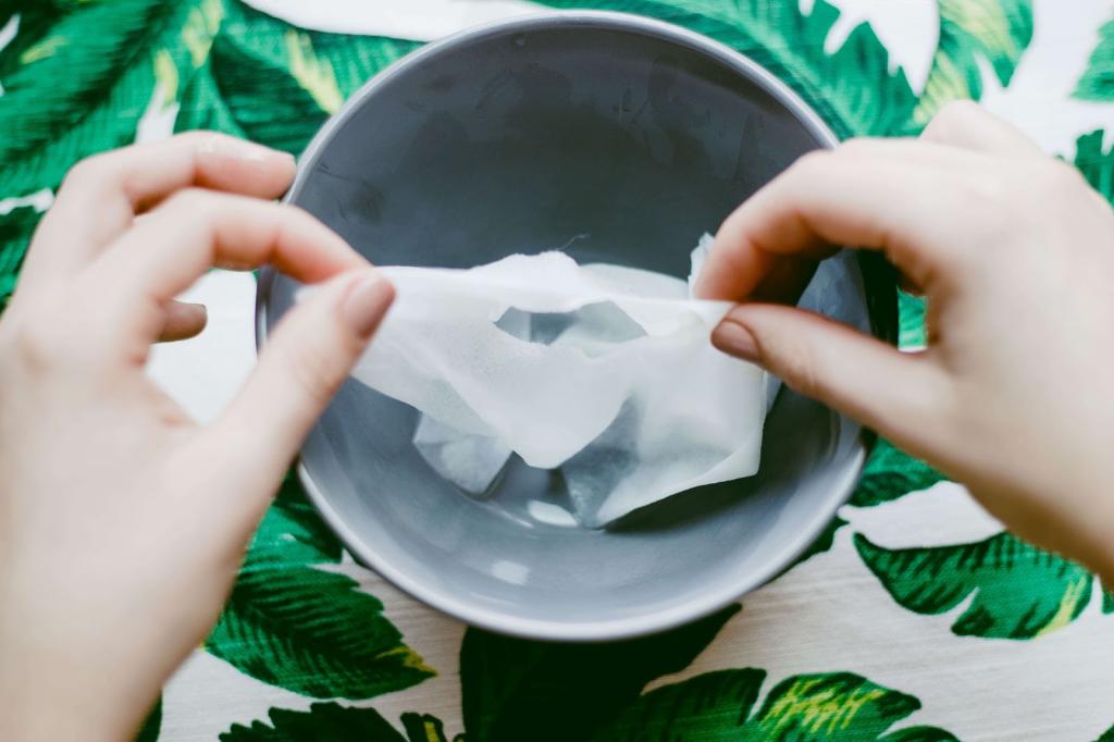 Берем маску и опускаем ее в тарелку, она должна полностью пропитаться приготовленной своими руками смесью.