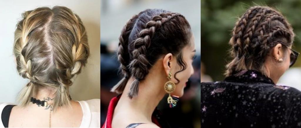 Красивая прическа, которую вы можете выполнить довольно быстро. Разделите волосы вертикальным пробором сзади и заплетите каждую из частей французским плетением, начиная снизу вверх. Нижние короткие пряди, не вошедшие в плетение, соберите в хвостики.