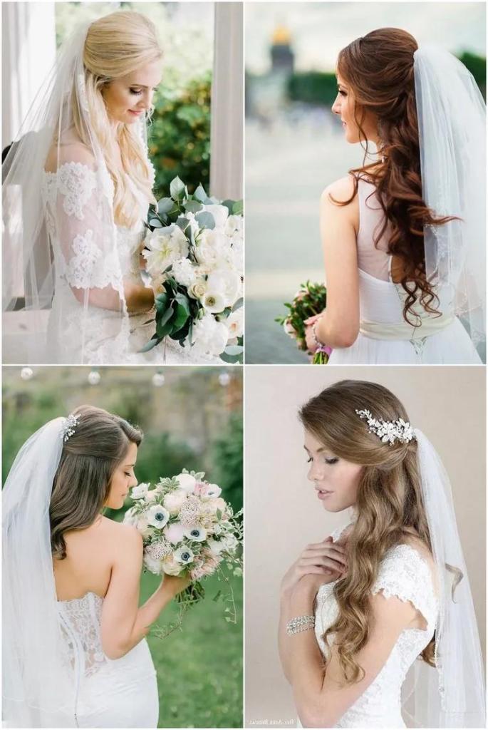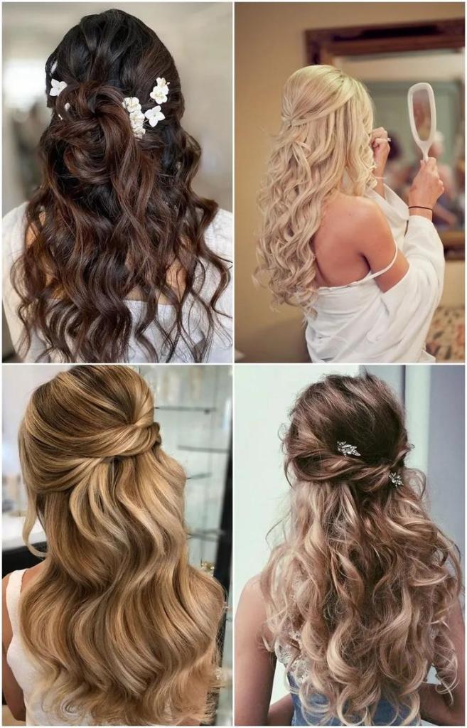 Очень мудрым и верным решением будет остановить свой выбор на трендовой прическе с полураспущенными волосами. Под фатой такие укладки смотрятся особо привлекательно, также они выглядят эффектно при оформлении декоративными заколками, цветами, лентами и пр. Возьмите за основу «мальвинку», пучок, «ракушку» и другие модели причесок, завейте локоны, чтобы волосы смотрелись пышными и еще более красивыми.