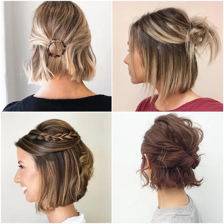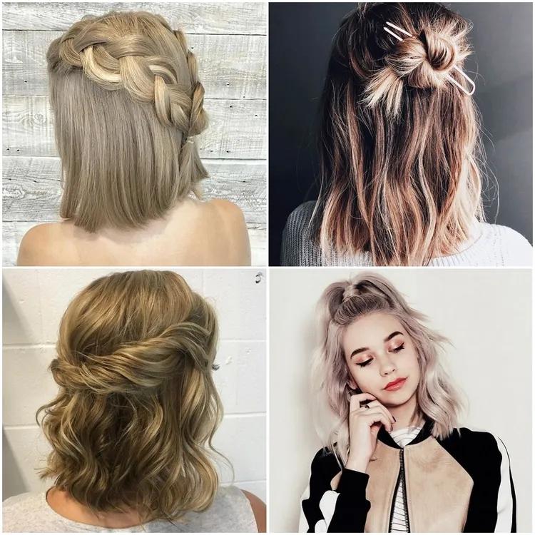 Есть множество стильных вариантов оформления причесок на волосы средней и небольшой длины. К примеру, вы можете сделать «мальвинку», собрав верхнюю часть волос, предварительно разделив волосы горизонтальным пробором. Также можно сделать половинный пучок, сплести две косички по бокам и также собрать их вместе с верхней частью волос в хвостик. Работайте с верхней частью, оставив нижние волосы распущенными.