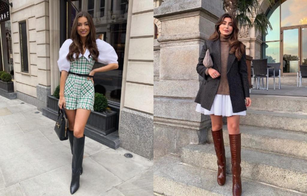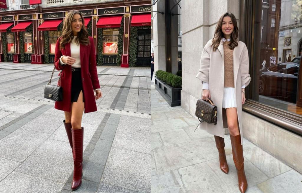 Женственно и стильно смотрятся образы плазакор, состоящие из коротких юбок, свитеров и приталенных длинных пальто. В данном случае наряд эффектно дополняют высокие сапоги.