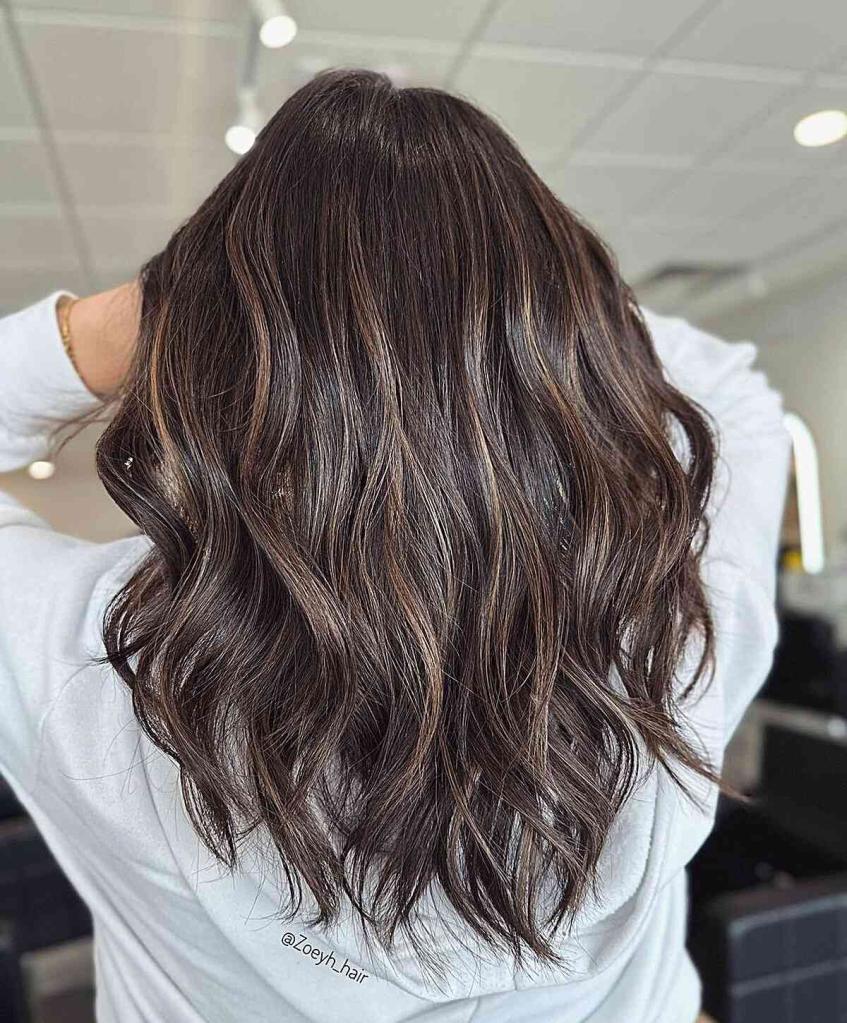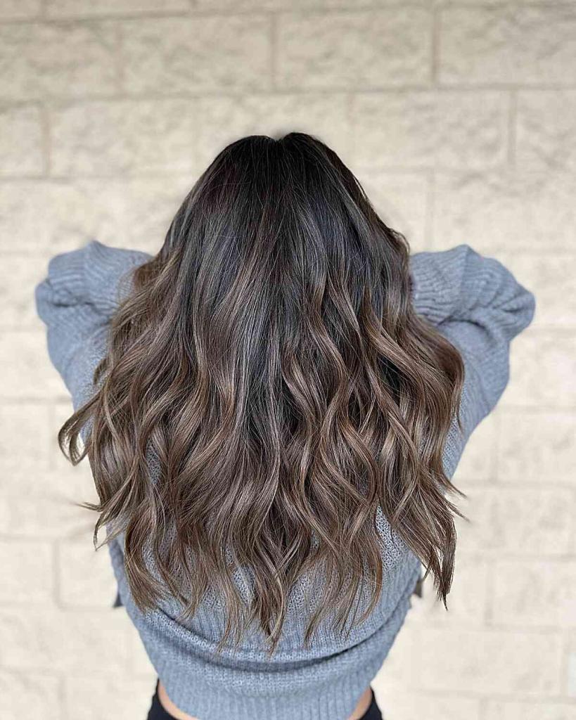 Попросите парикмахера создать темные контрастные блики на пепельно-коричневом фоне. Такое окрашивание гармонично сочетается с волнистой текстурой волос. Если у вас прямые пряди, то добавьте объемные волны с помощью плойки.