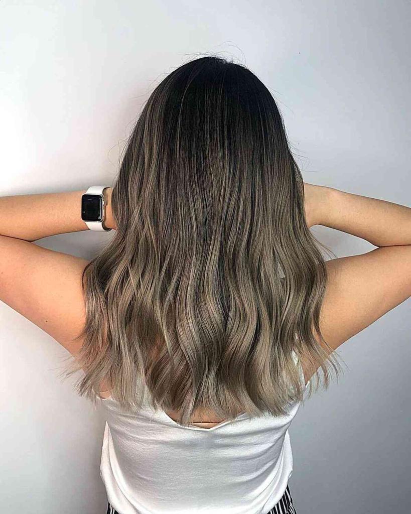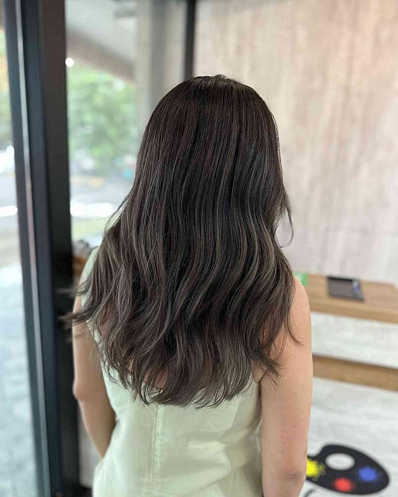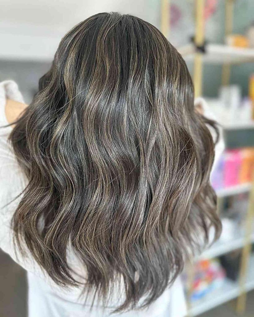 Пепельно-каштановые блики на темном фоне - классическое и элегантное сочетание. Они создают красивый контраст, а также придают прическе глубину и объем.