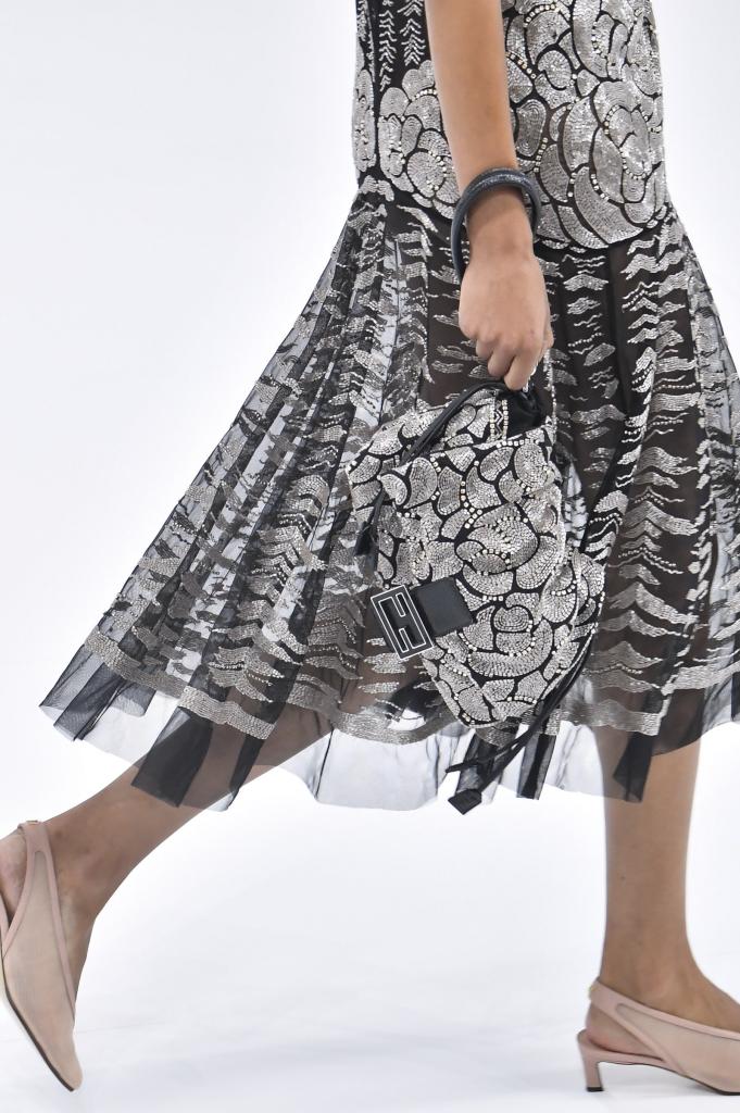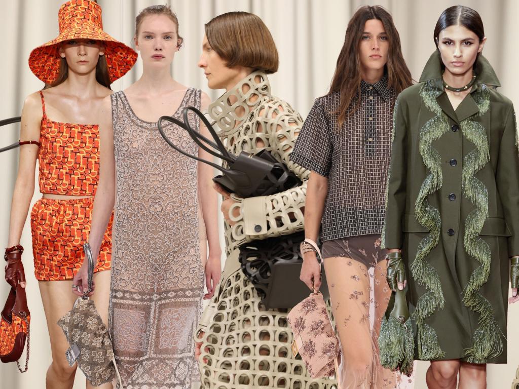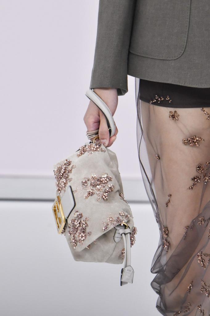 Среди вечерних образов можно было увидеть сумки и платья из одной и той же блестящей ткани. Кутюрье также поиграли с принтами, повторяя их в одежде и в сумках. А также повторялись и детали, например бахрома, пряжки, логотипы модных домов. Последние в предстоящем весенне-летнем сезоне станут главным украшением одежды и сумок.