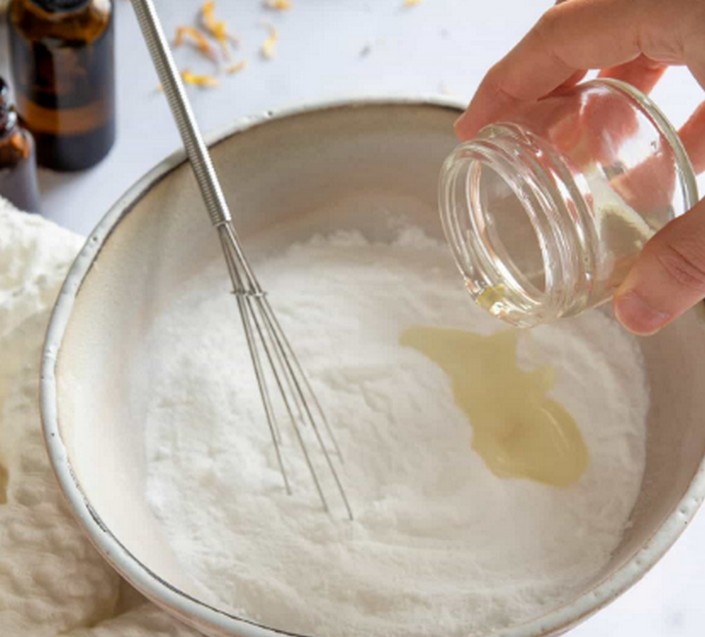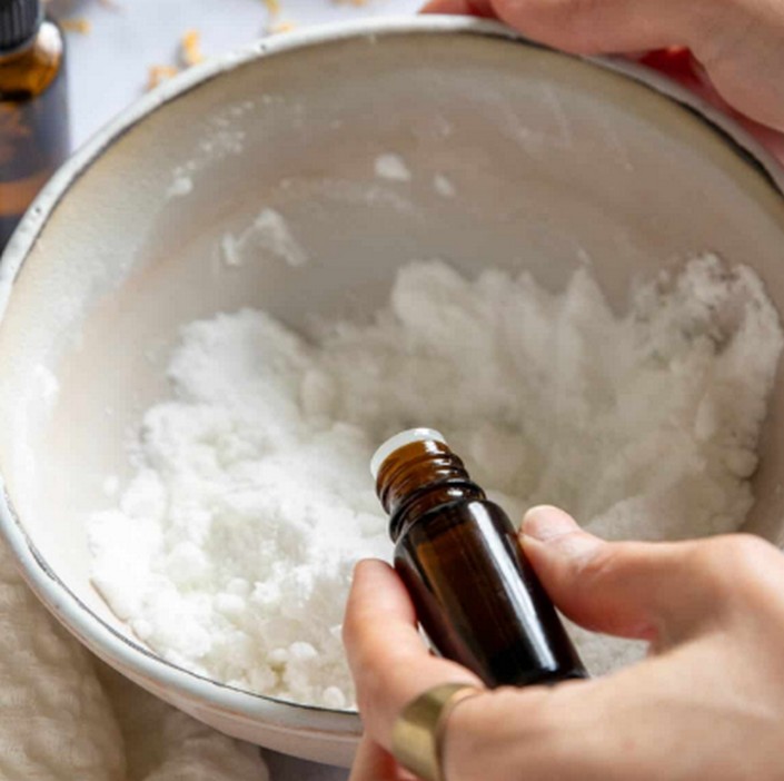 Смешайте эфирные масла и растопленное кокосовое масло в небольшой миске. Добавьте масло в сухую смесь и перемешайте руками, чтобы оно полностью впиталось и растворило все комочки. Смесь должна быть похожа на мокрый песок.