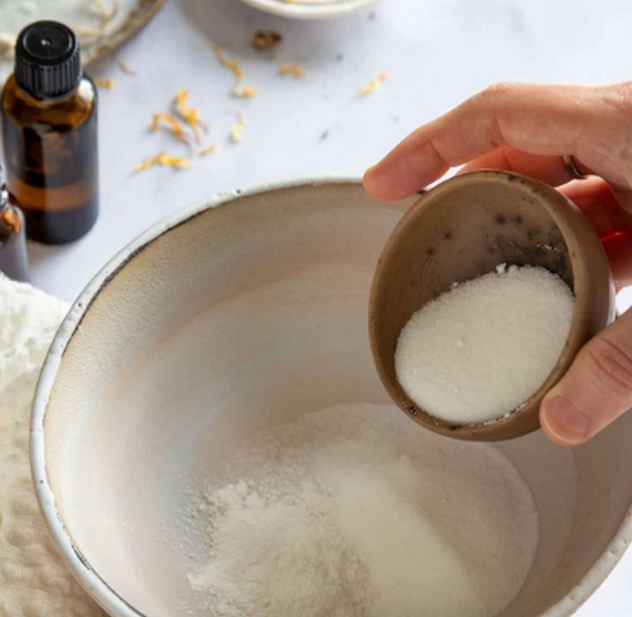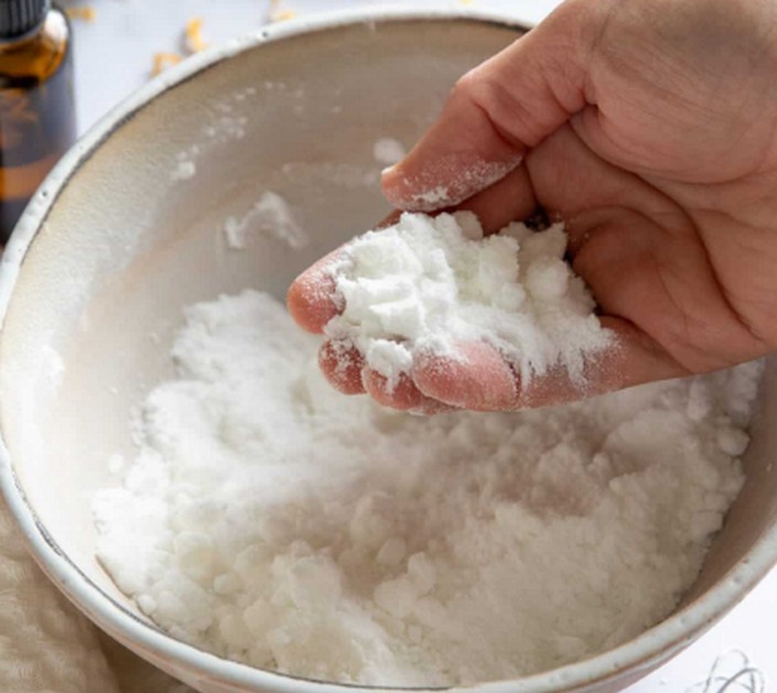В большую миску для смешивания компонентов добавьте пищевую соду, лимонную кислоту и каолиновую глину. Хорошо перемешайте.